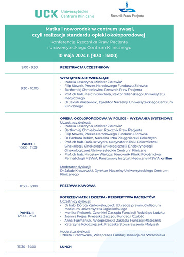 Organizowana przez Uniwersyteckie Centrum Kliniczne, szpital kliniczny GUMed wspólnie z Rzecznikiem Praw Pacjenta konferencja Matka i noworodek w centrum uwagi, czyli realizacja standardu opieki okołoporodowej odbędzie się 10 maja 2024 r. w godz. 9:30-16:00 w auli im. prof. Zdzisława Kieturakisa w CMI. Wydarzenie objęte jest patronatem rektora GUMed prof. Marcina Gruchały.