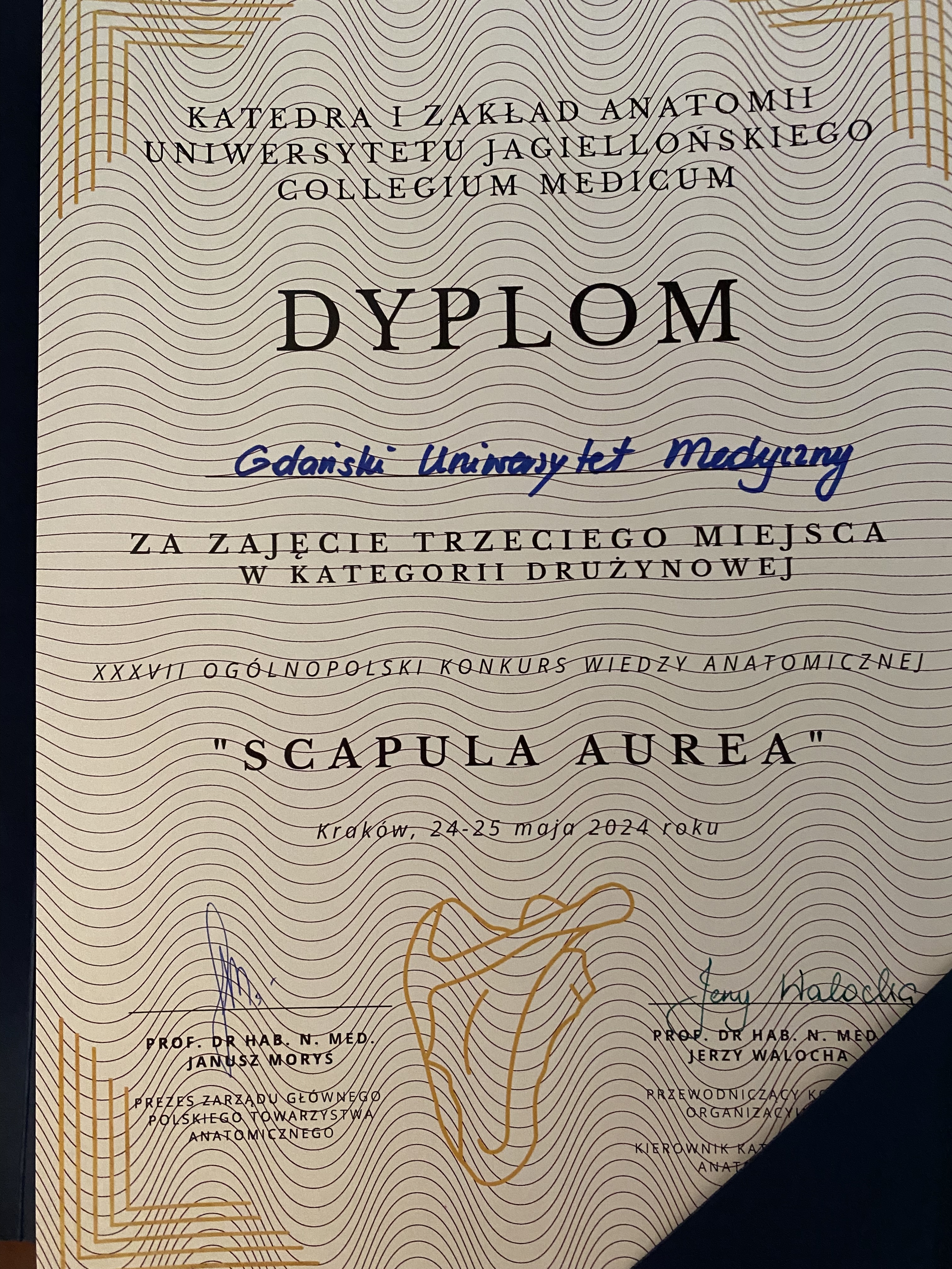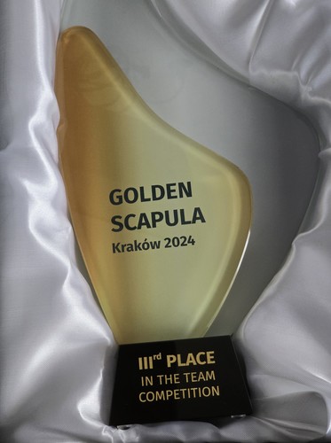Studenci Gdańskiego Uniwersytetu Medycznego – Dominika Sawicka, Oliwier Szydlar oraz Zuzanna Żyraz wywalczyli drużynowo 3 miejsce w konkursie Scapula Aurea 2024. Ponadto Zuzanna Żyra zdobyła 2 najwyższy wynik w części teoretycznej. W kategorii studentów anglojęzycznych Emilia Powierża, Ifure Ekainyang i Sunniva Klunges również zajęli 3 miejsce w kategorii drużynowej Golden Scapula 2024. Przygotowania do konkursu, jak i opieka nad studentami na miejscu należała do dr Jana Spodnika z Zakładu Anatomii i Neurobiologii kierowanego przez dr. hab. Przemysława Kowiańskiego, prof. uczelni. W przygotowaniach pomagali mu i towarzyszyli w trakcie konkursu członkowie SKN przy Zakładzie Anatomii i Neurobiologii GUMed – Ilya Krypets i Jakub Kaczorowski.