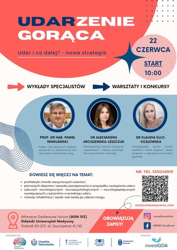 Spotkanie Udarzenie gorąca – Udar i co dalej? Nowe strategie odbędzie się 22 czerwca 2024 r. o godz. 10:00 w budynku Atheneum Gedanense Novum (AGN 103). Wydarzenie skupia się na profilaktyce i leczeniu udarów mózgu. Organizatorem spotkania jest Międzyuczelniane Koło Naukowe Neuropsychologii i Neuronauki.