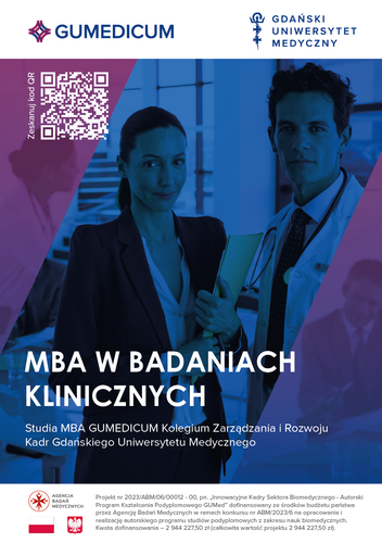 MBA w badaniach klinicznych to autorski kierunek Kolegium Zarządzania i Rozwoju Kadr Gdańskiego Uniwersytetu Medycznego. Studia będą trwały 4 semestry i będą prowadzone w trybie niestacjonarnym, z zajęciami w piątek, sobotę i niedzielę.
