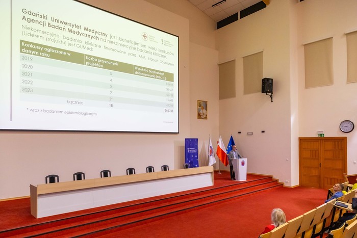 Prezentując osiągnięcia Multidyscyplinarnego Centrum Wsparcia Badań Klinicznych GUMed-UCK-UCS, prof. Piotr Widłak przypomniał, że Uczelnia jest realizatorem 18 projektów finansowanych z Agencji o łącznej wartości dofinansowania w wysokości 244,735 mln zł oraz przybliżył plany rozwojowe jednostki.