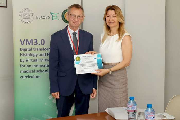 Przedstawiciele Katedry i Zakładu Histologii GUMed: prof. Piotr Wierzbicki jako lider projektu oraz kierownik jednostki prof. Michał Żmijewski i prof. Zbigniew Kmieć jako wiceliderzy wzięli udział w cyklicznej konferencji naukowo-dydaktycznej, która odbył się w Uniwersytecie Medycznym w Płowdiwie w Bułgarii w dniach 13-14 czerwca 2024 r. Spotkanie zorganizowano w ramach grantu UE Erasmus+ pt. Digital transformation of Histology and Histopathology by Virtual Microscopy (VM) for an innovative medical school curriculum (VM3.0). Ze strony naszej Uczelni zaangażowani w projekt są również specjalistki Katedry i Zakładu Histologii: dr Agata Wrońska, dr Anna Kotulak-Chrząszcz i dr hab. Anna Piotrowska oraz Dariusz Zawada z Działu Infrastruktury IT.