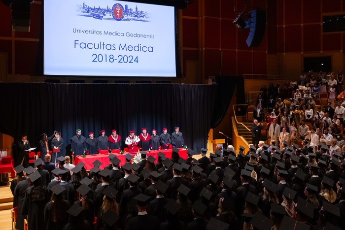 Sto czterdzieścioro czworo absolwentów kierunku lekarskiego – English Division rocznika 2018-2024 odebrało swoje dyplomy. W uroczystości zorganizowanej 1 lipca 2024 r. w Polskiej Filharmonii Bałtyckiej im. Fryderyka Chopina w Gdańsku za stołem prezydialnym zasiedli: rektor GUMed prof. Marcin Gruchała, prorektor ds. studenckich dr hab. Tomasz Smiatacz, dziekan Wydziału Lekarskiego prof. Radosław Owczuk, prodziekani WL: prof. Ewa Słomińska, dr hab. Maria Bieniaszewska, prof. Paweł Zagożdżon, dr hab. Kamil Chwojnicki, a także prof. Piotr Wąż, prodziekan Wydziału Nauk o Zdrowiu i dr hab. Bartosz Wielgomas, prof. uczelni, prodziekan Wydziału Farmaceutycznego.