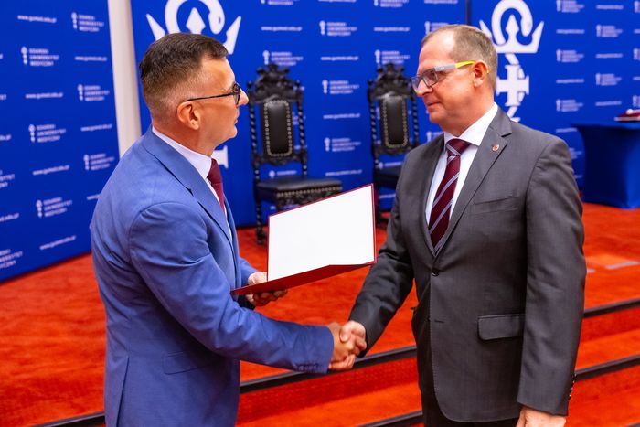 Po ślubowaniu rektor prof. Marcin Gruchała symbolicznie przekazał insygnia władzy rektorowi Michałowi Markuszewskiemu, który następnie wręczył powołania władzom kadencji 2024-2028: