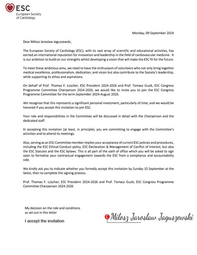 – “European Society of Cardiology” (ESC), dzięki szerokiemu zakresowi działalności naukowej i edukacyjnej, zdobyło międzynarodową renomę za innowacyjność w dziedzinie medycyny sercowo-naczyniowej – mówi prof. Miłosz Jaguszewski. – Ambicją Polskiego Towarzystwa Kardiologicznego (PTK) jest istotne zwiększenie udziału jego członków w budowaniu siły ESC poprzez połączenie doskonałości zawodowej, profesjonalizmu, ale i zaangażowania naukowego. Dzięki ścisłej współpracy z prezesem PTK prof. Robertem Gilem, prezesem ESC Thomasem Luescherem, będę miał przyjemność reprezentować w ESC naszą Klinikę oraz PTK w nadchodzącej kadencji Zarządu ESC. To dla mnie duży zaszczyt, ale i konkretne zobowiązanie.