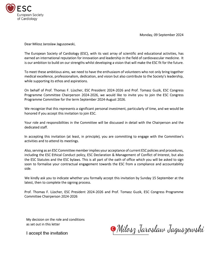 Profesor Miłosz Jaguszewski z I Kliniki Kardiologii GUMed został powołany do jednego z komitetów Zarządu Głównego Europejskiego Towarzystwa Kardiologicznego – Komitetu Naukowego Kongresów (CPC) ESC. Zakres działalności prof. Miłosza Jaguszewskiego w Komitecie ESC obejmować będzie przede wszystkim tematykę interwencji sercowo-naczyniowych.