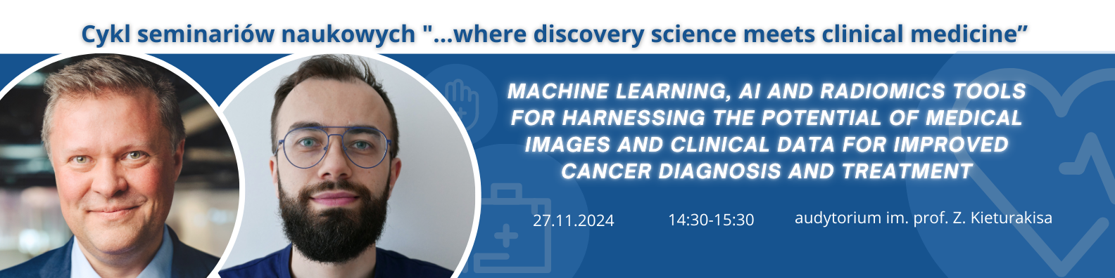 Gośćmi listopadowego spotkania będą dr Maciej Bobowicz z II Zakładu Radiologii oraz dr Bartłomiej Tomasik z Katedry i Kliniki Onkologii i Radioterapii. Tematem seminarium będzie: Machine learning, AI and radiomics tools for harnessing the potential of medical images and clinical data for improved cancer diagnosis and treatment.