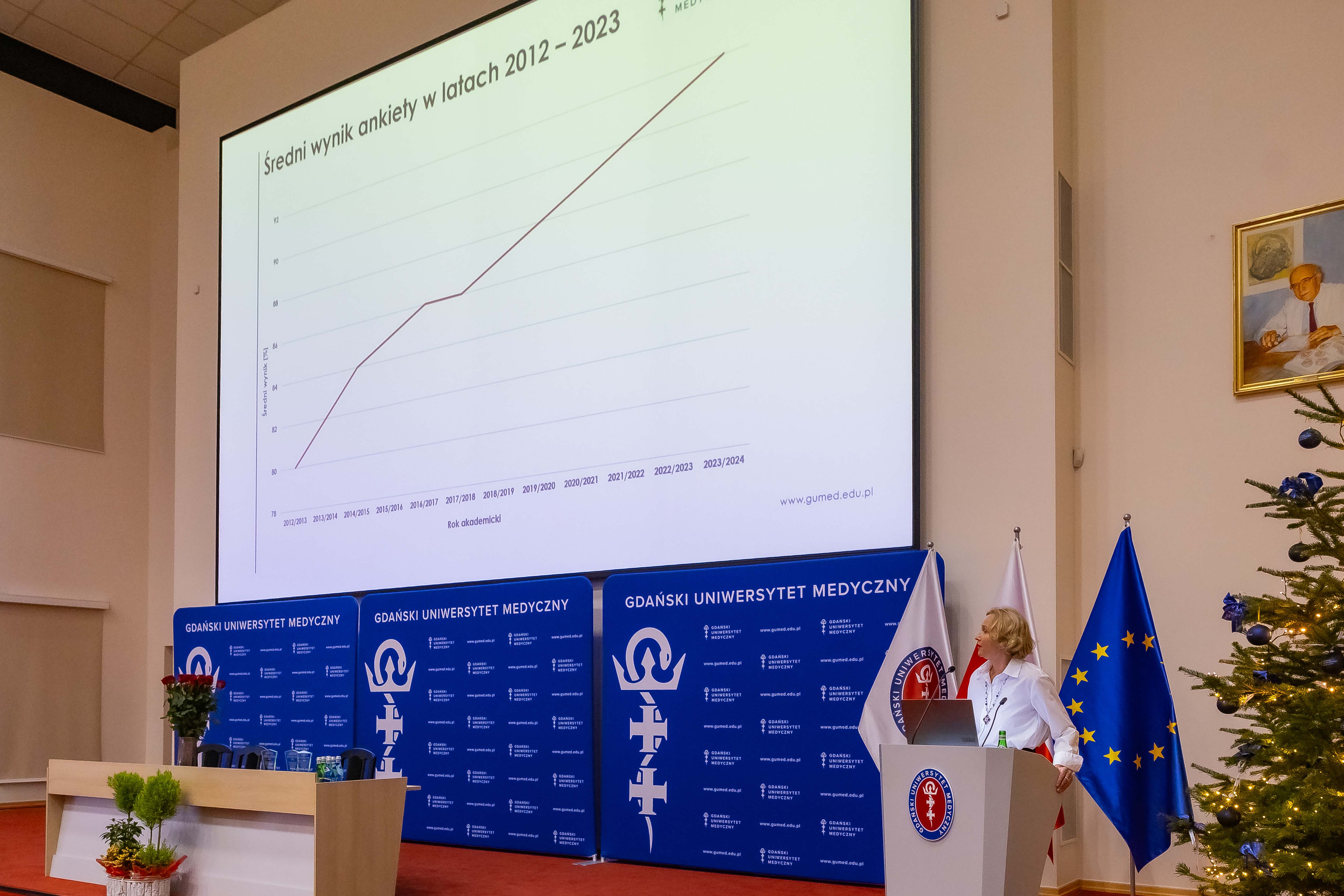 – To bardzo ważny dzień. Wydarzenie, które docenia nauczycieli akademickich w ich wysiłkach na rzecz jakości kształcenia. Dużo mówimy o jakości badań naukowych, o tym, że chcemy być świetną uczelnią i jesteśmy coraz lepsi naukowo. Naukę łatwo jest ocenić, porównać, na podstawie różnych parametrów, a praktykę i jakość – zdecydowanie trudniej. Nie ma jednoznacznych miar, które pozwalałyby na takiego typu porównania i oceny jakości. Ale mamy coś takiego, jak ankiety. Które mają na naszej uczelni długą tradycję. (…) Wielkie podziękowania dla doktorantów, dla studentów za wasze zaangażowanie w wypełnianie ankiet, komentarze. Te ankiety bez waszego udziału nie miałyby sensu – powiedział prof. Michał Markuszewski, rektor GUMed.