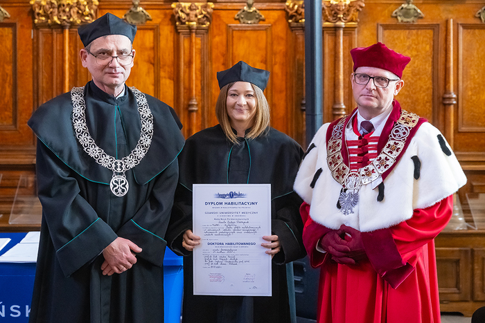 Anna Michalik, Krzysztof Sobczak i dr. inż. Maciej Tankiewicz otrzymali dyplomy doktora habilitowanego nauk o zdrowiu z rąk prof. Jędrzeja Antosiewicza.