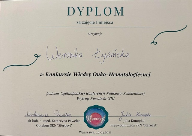 Weronika Łyzińska, studentka V roku kierunku lekarskiego GUMed i przewodnicząca studenckiego koła naukowego The English Division Pediatric Oncology Scientific Circle działającego przy Klinice Pediatrii, Hematologii i Onkologii GUMed, zajęła I miejsce podczas XIII Ogólnopolskiej Konferencji Naukowej Wytrop nowotwór. Wydarzenie odbyło się 29 marca br. w Warszawie.