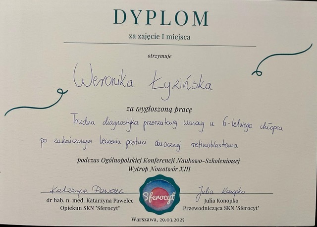 Nagrodzona prezentacja, zatytułowana Trudna diagnostyka przerzutowej wznowy u 6-letniego chłopca po zakończonym leczeniu postaci obuocznej retinoblastoma – opis przypadku powstała pod kierunkiem prof. Ewy Bień i dr Małgorzaty Krawczyk, założycielek i opiekunek koła The English Division Pediatric Oncology Scientific Circle.