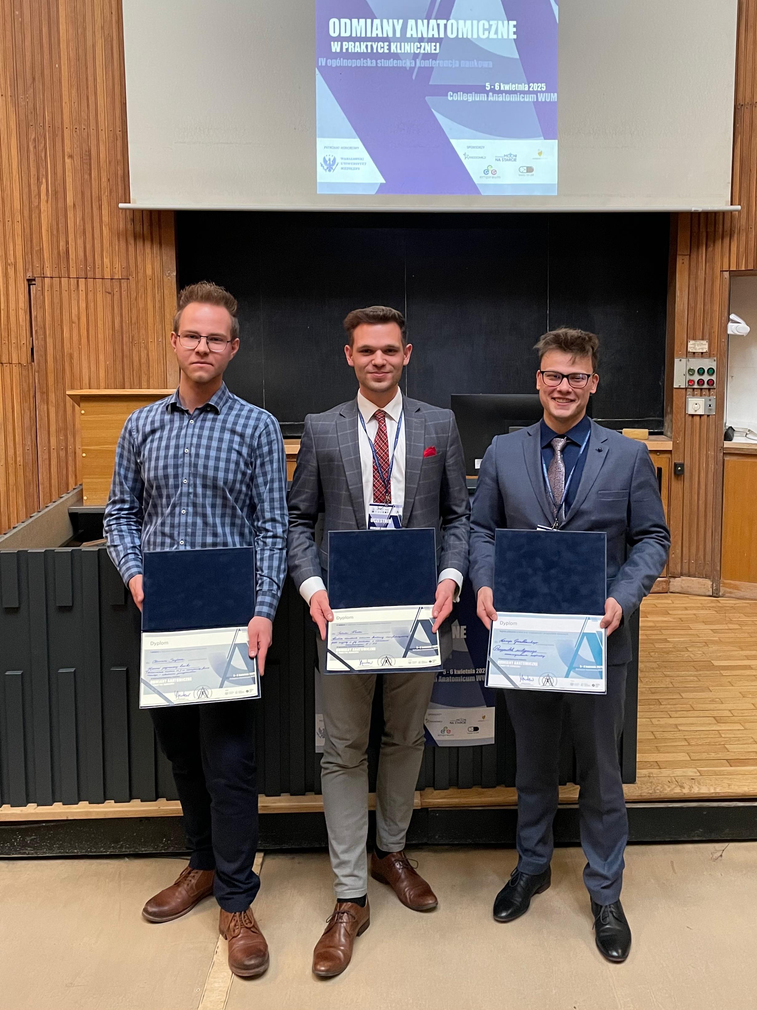 Oliwier Szylar, Jakub Kloska oraz Maciej Grządkowski, studenci kierunku lekarskiego GUMed zostali nagrodzeni podczas IV Ogólnopolskiej Studenckiej Konferencji Naukowej Odmiany anatomiczne w praktyce klinicznej odbywającej się w Warszawskim Uniwersytecie Medycznym. GUMed reprezentowało w sumie 9 studentów SKN przy Zakładzie Anatomii i Neurobiologii.