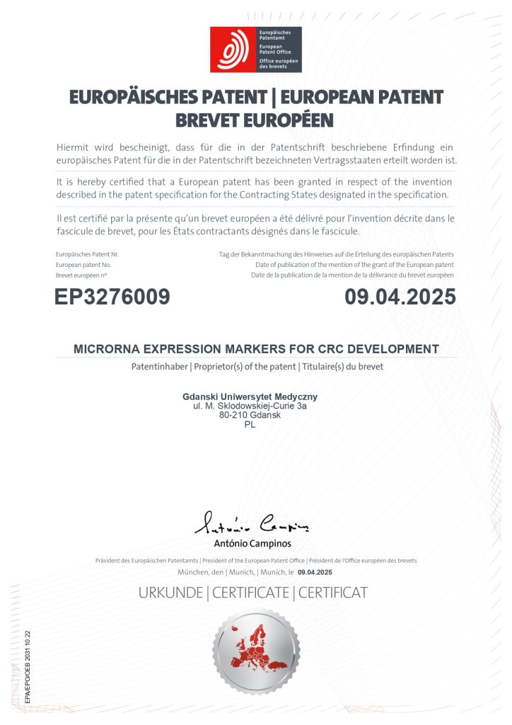 Dwa zespoły naukowców Gdańskiego Uniwersytetu Medycznego otrzymały patenty na swoje wynalazki przyznawane przez Europejski Urząd Patentowy.