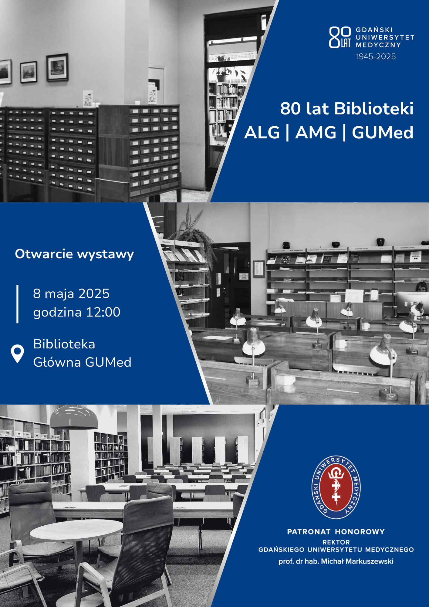 Serdecznie zapraszamy na uroczyste otwarcie jubileuszowej wystawy 80 lat Biblioteki Gdańskiego Uniwersytetu Medycznego. Wydarzenie odbędzie się 8 maja 2025 roku o godzinie 12:00 w holu Biblioteki Głównej. Data uroczystości jest nieprzypadkowa, ponieważ w tym dniu obchodzony jest również Ogólnopolski Dzień Bibliotekarza i Bibliotek.