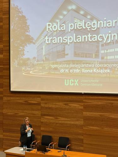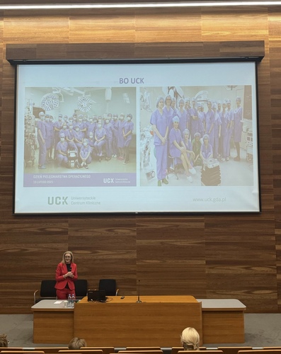 W pierwszej części spotkania mgr Monika Łęgosz, kierownik Bloków Operacyjnych Uniwersyteckiego Centrum Klinicznego w Gdańsku, przybliżyła uczestnikom specyfikę pracy oraz proces adaptacji zawodowej pielęgniarki operacyjnej. Z kolei dr Ilona Książek, również związana z UCK, omówiła tematykę pielęgniarstwa transplantacyjnego, podkreślając rolę zespołów interdyscyplinarnych i wysokich standardów opieki w zabiegach przeszczepów narządów.