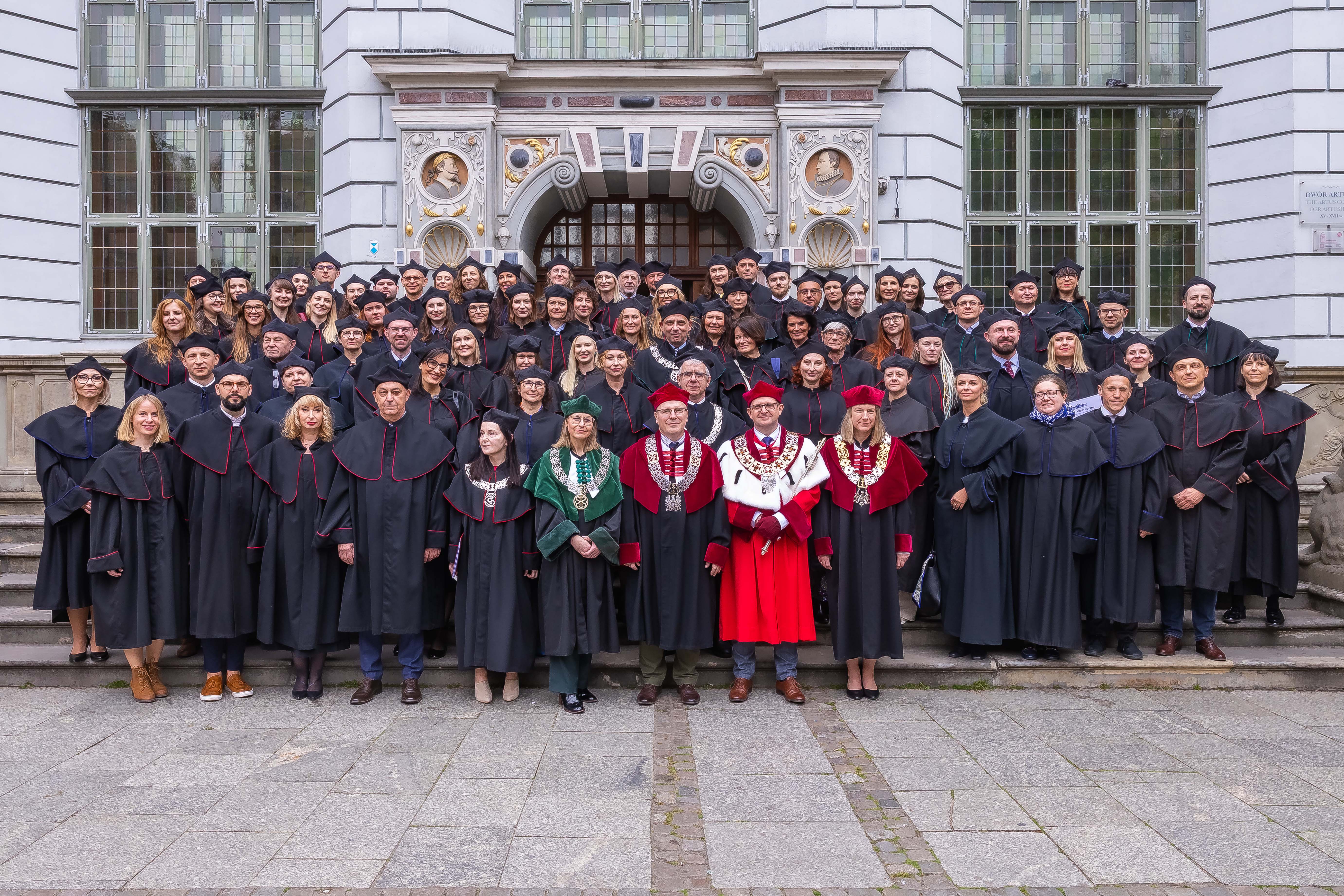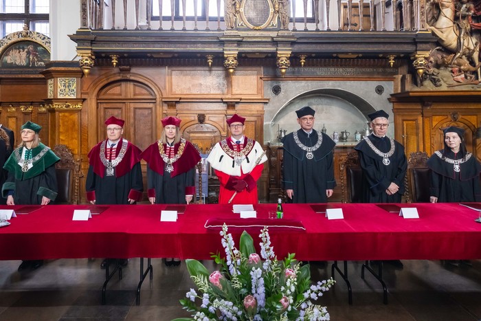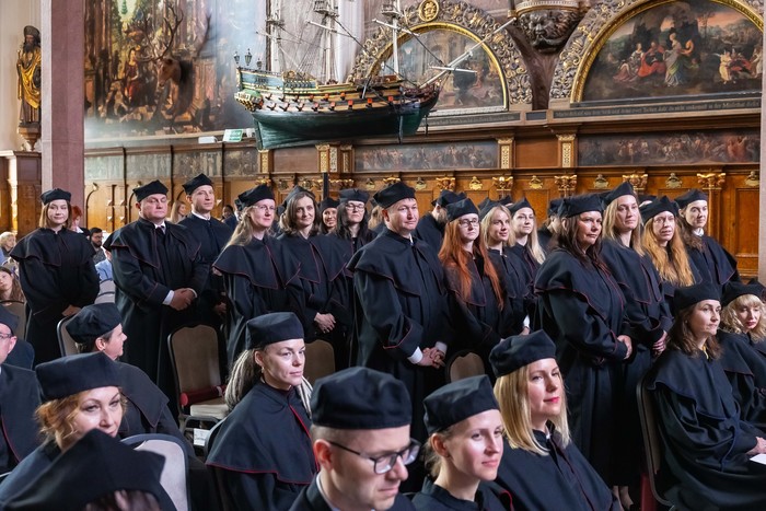 Doktorzy i doktorzy habilitowani nauk farmaceutycznych, nauk medycznych oraz nauk o zdrowiu odebrali swoje dyplomy 9 maja 2025 r. w Dworze Artusa. W uroczystości uczestniczyli: prof. Michał Markuszewski, rektor GUMed, prof. Anna Żaczek, prorektor ds. rozwoju i współpracy, prof. Michał Żmijewski, prorektor ds. nauki, prof. Magdalena Prokopowicz, dziekan Wydziału Farmaceutycznego.