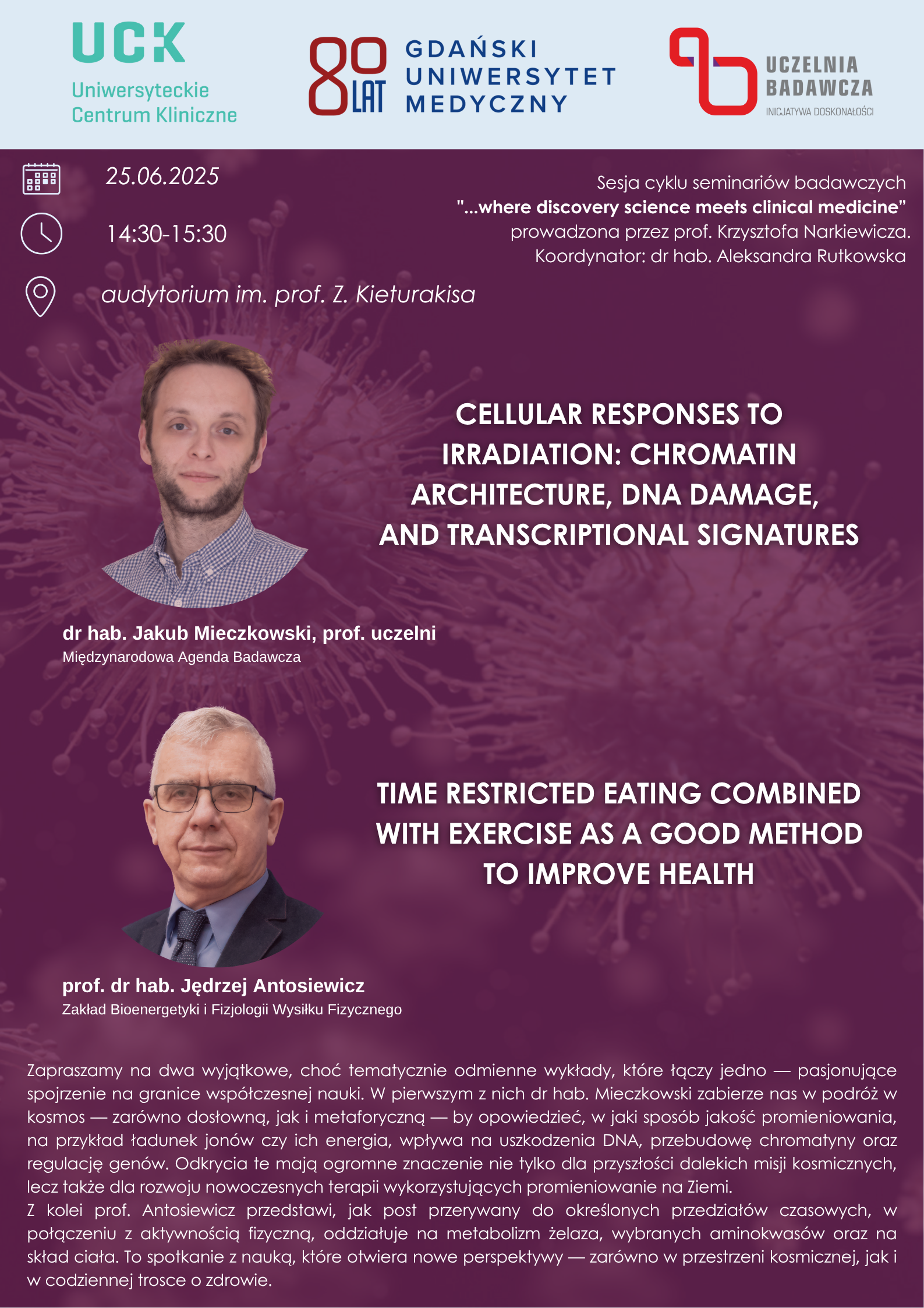 …where discovery science meets clinical medicine odbędzie się w środę 25 czerwca o godz. 14:30 w audytorium im. prof. Zdzisława Kieturakisa w Centrum Medycyny Inwazyjnej UCK.